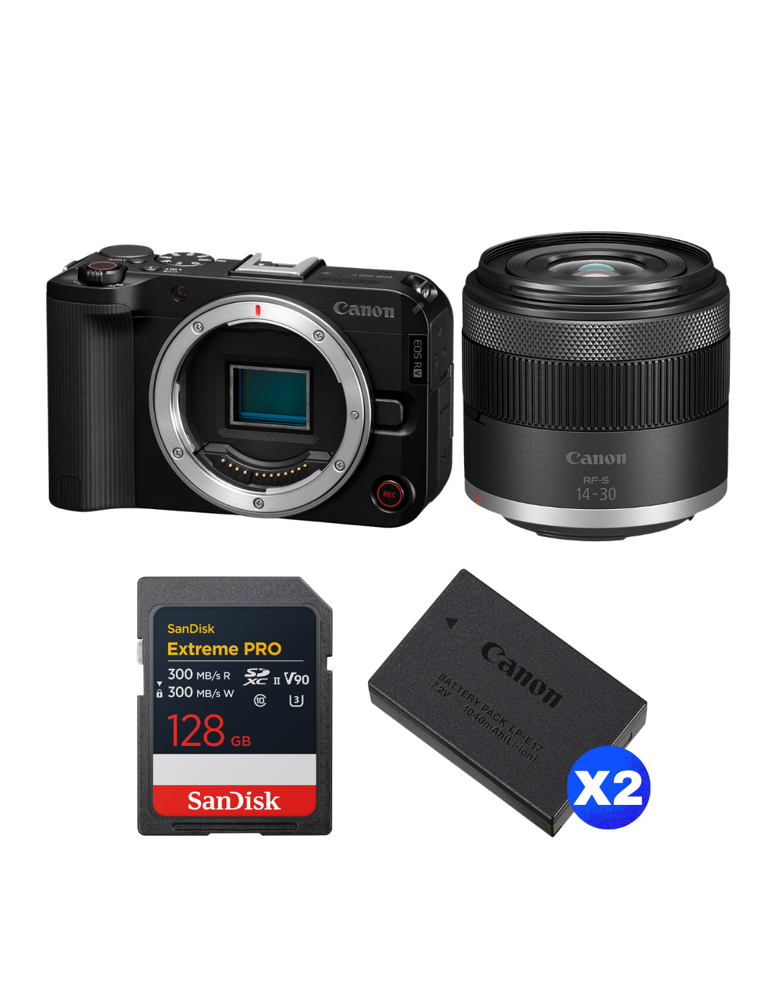 Canon EOS R50 V + RF-S 14-30mm f/4.5-6.3 IS STM PZ + 1 SanDisk 128GB Extreme PRO UHS-II SDXC + 2 Canon LP-E17