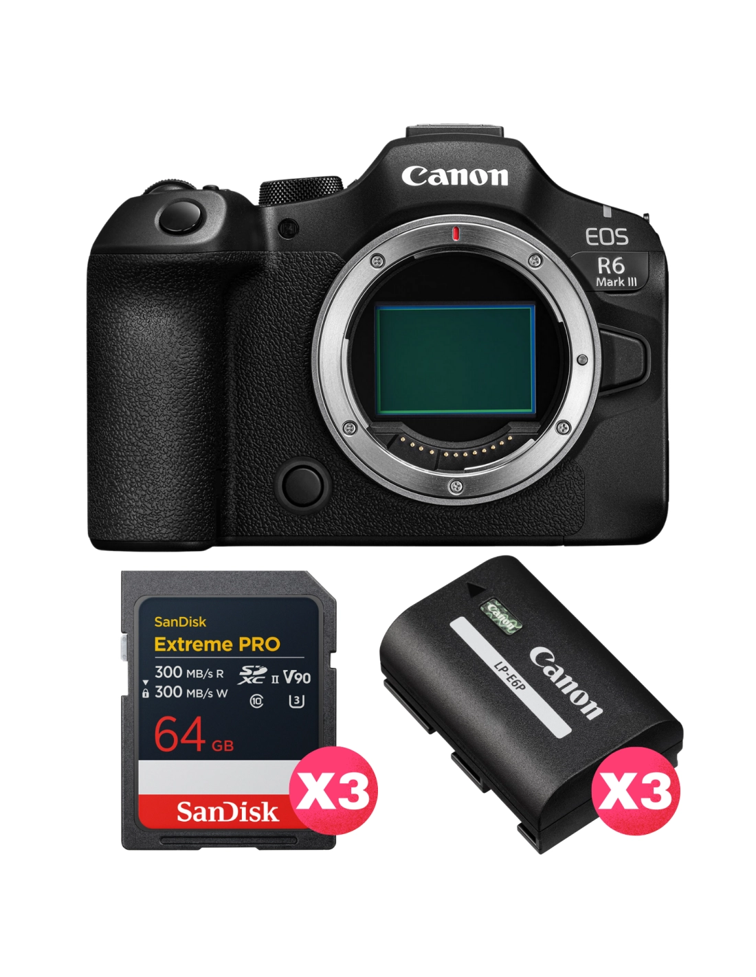 Canon EOS R6 Mark III + 3 SanDisk 64GB Extreme PRO UHS-II SDXC + 3 Canon LP-E6P