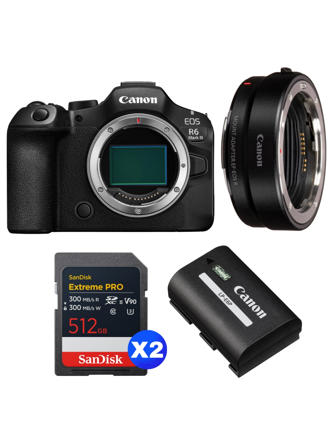 Canon EOS R6 Mark III + Canon EF-EOS R + 2 SanDisk 512GB Extreme PRO UHS-II SDXC + Canon LP-E6P