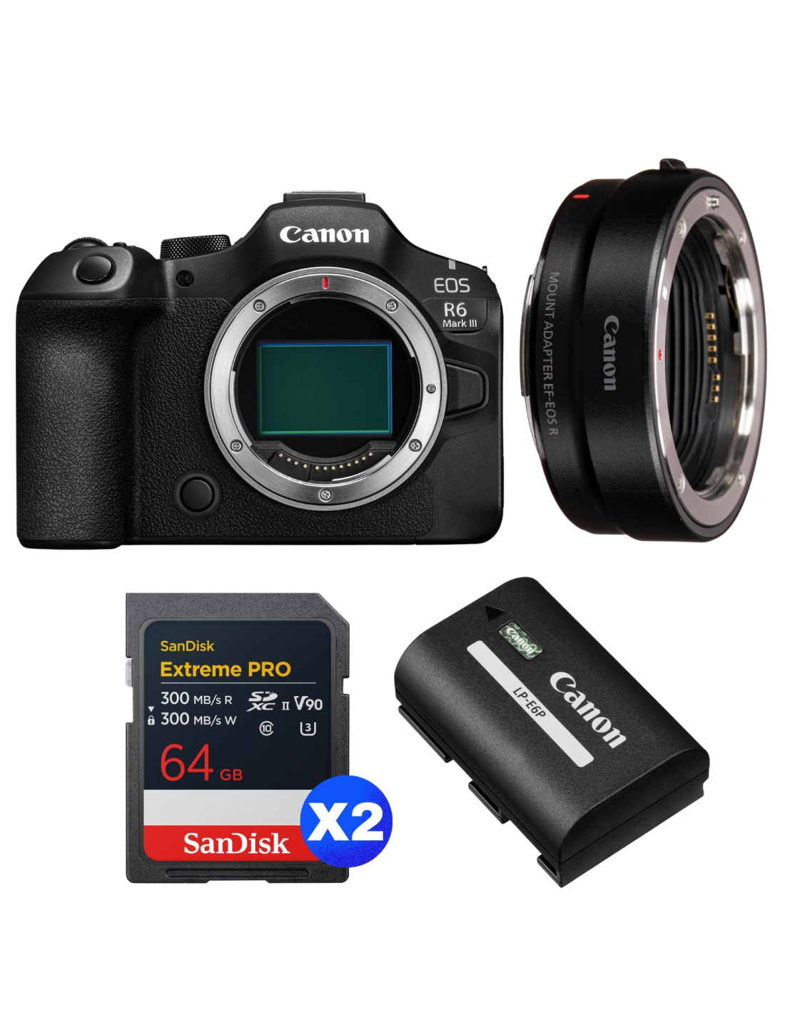 Canon EOS R6 Mark III + Canon EF-EOS R + 2 SanDisk 64GB Extreme PRO UHS-II SDXC + Canon LP-E6P