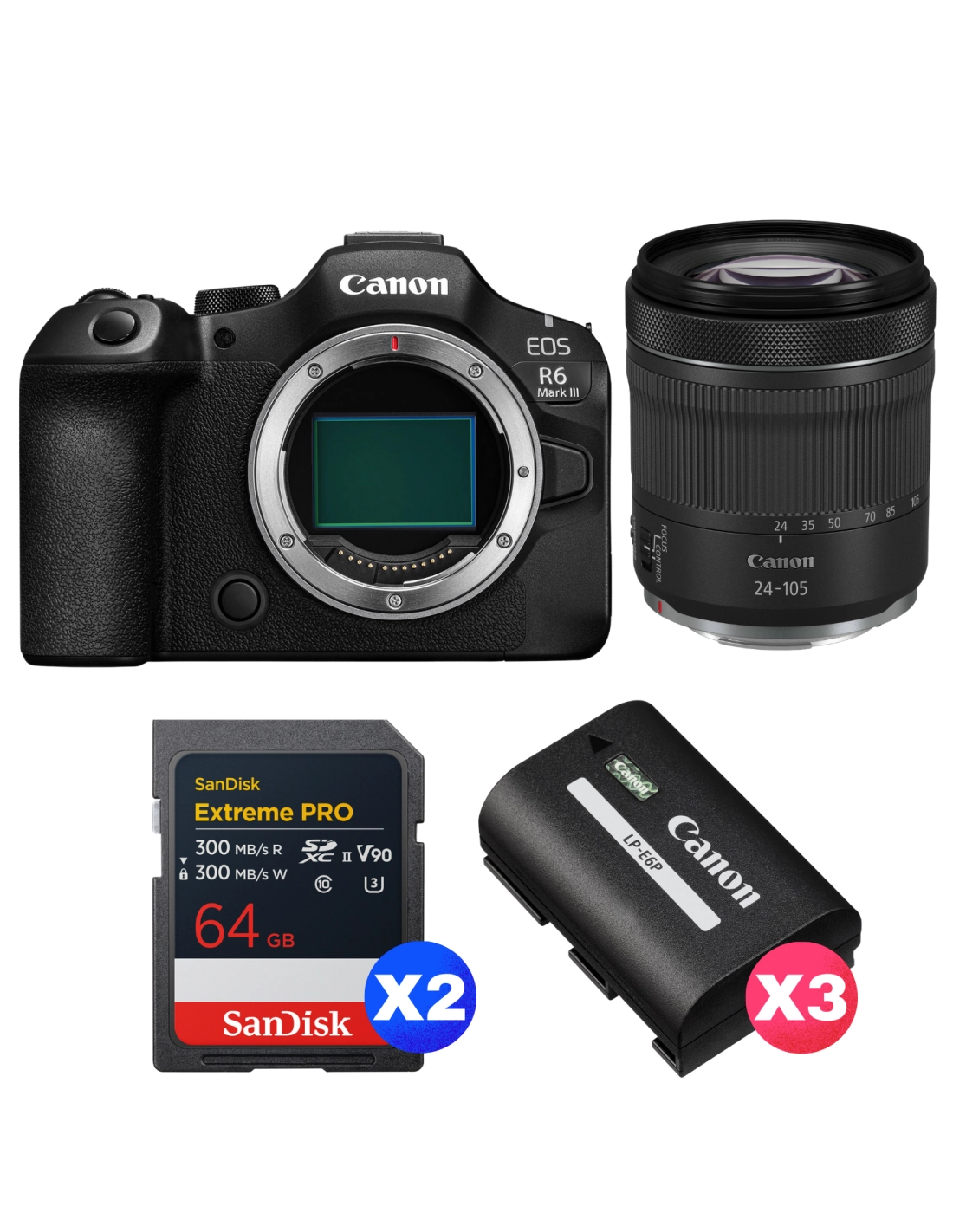 Canon EOS R6 Mark III + RF 24-105mm f/4-7.1 IS STM + 2 SanDisk 64GB Extreme PRO UHS-II SDXC + 3 Canon LP-E6P