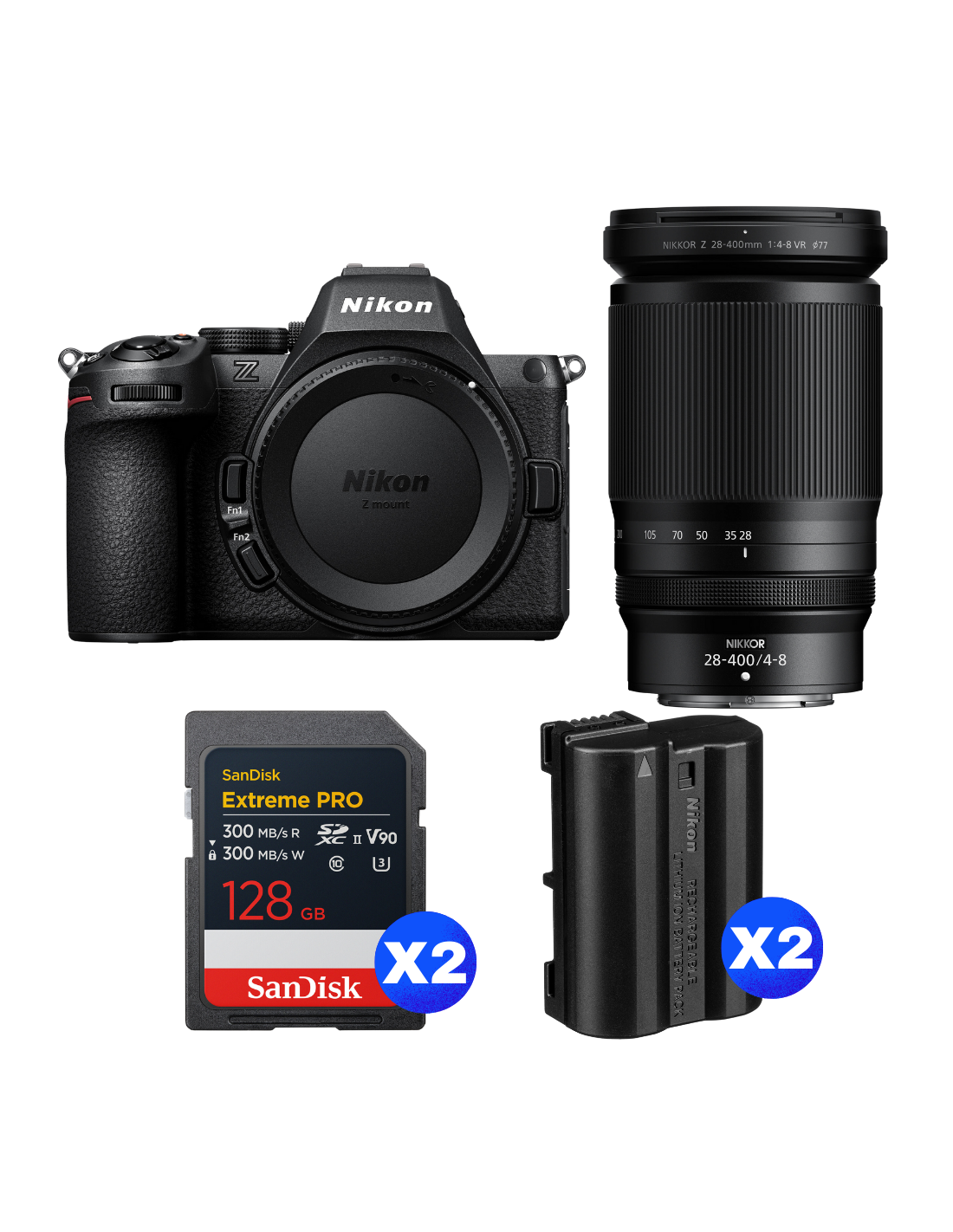 Nikon Z5 II + 28-400mm f/4-8 VR + 2 SanDisk 128GB Extreme PRO UHS-II SDXC + 2 Nikon EN-EL15c