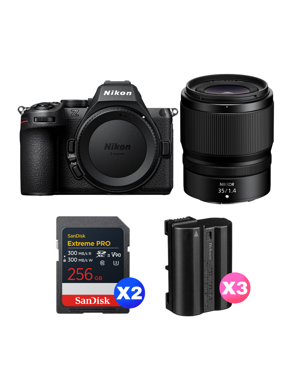 Nikon Z5 II + 35mm f/1.4 + 2 SanDisk 256GB Extreme PRO UHS-II SDXC + 3 Nikon EN-EL15c
