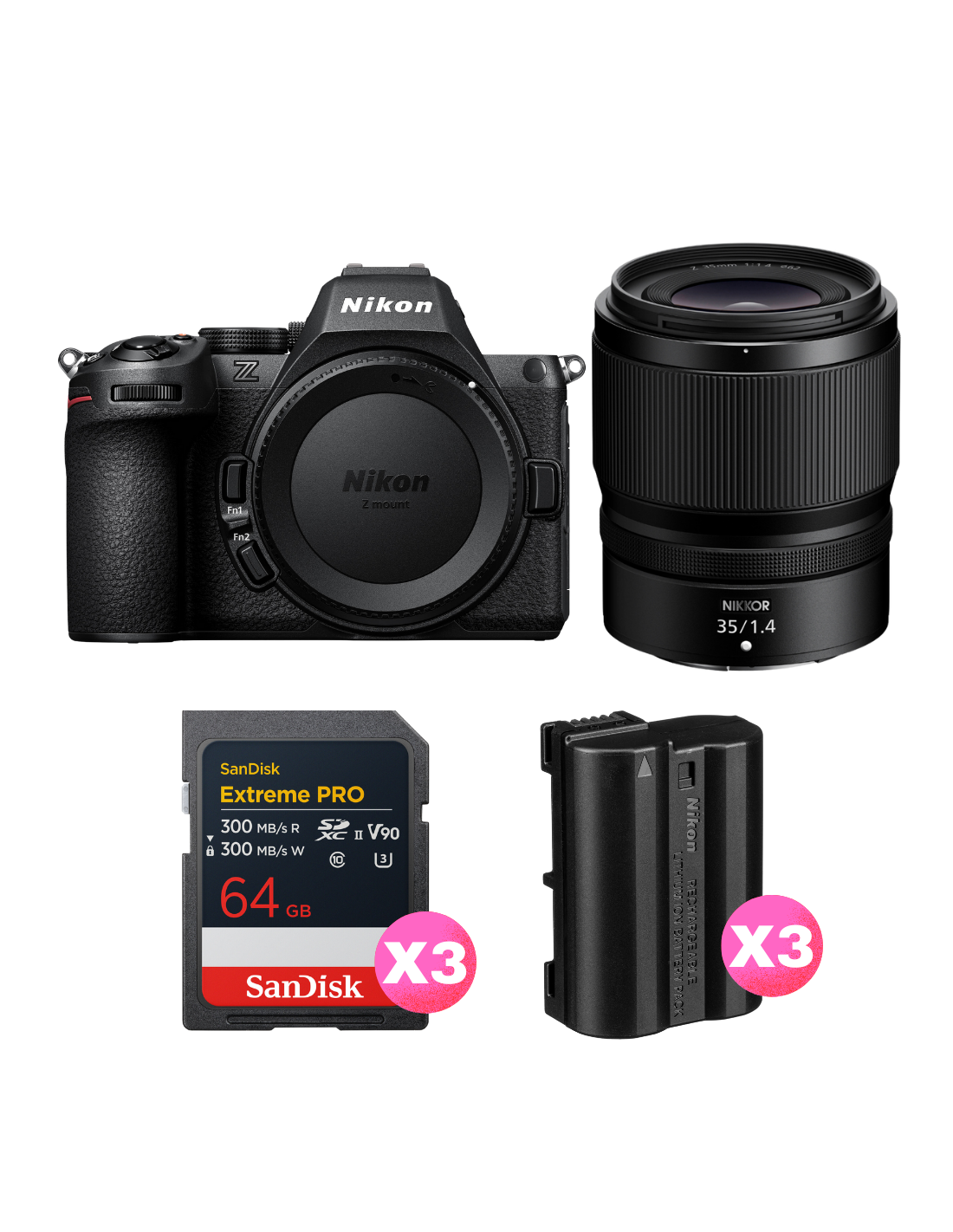 Nikon Z5 II + 35mm f/1.4 + 3 SanDisk 64GB Extreme PRO UHS-II SDXC + 3 Nikon EN-EL15c
