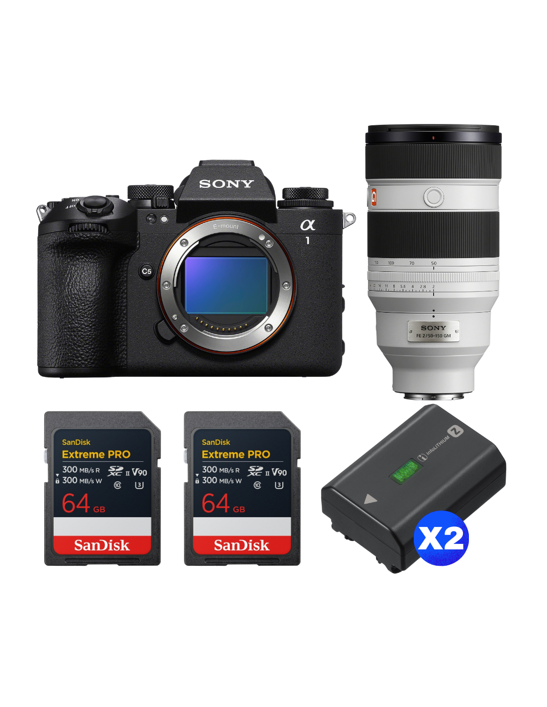 Sony alpha 1 II + FE 50-150mm f/2 GM + 2 SanDisk 64GB Extreme PRO UHS-II SDXC + 2 Sony NP-FZ100