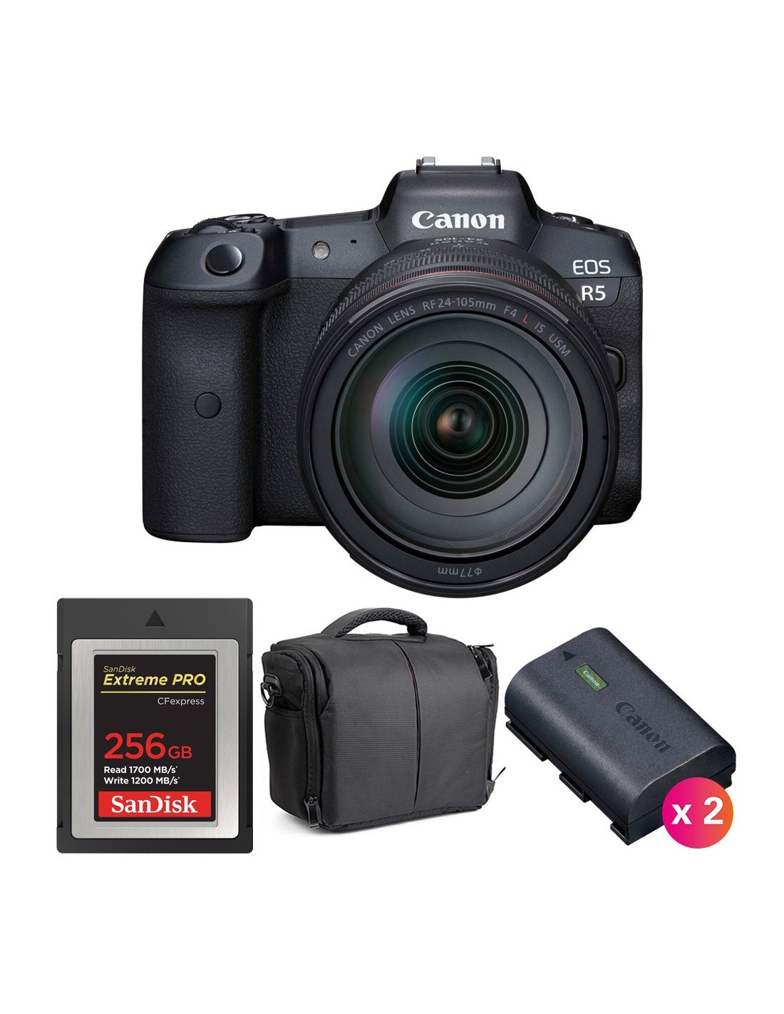 Canon EOS R5 + RF 24-105mm f/4L IS USM + SanDisk 256GB Extreme PRO CFexpress Type B + 2 LP-E6NH + Bolsa - Camara mirrorless
