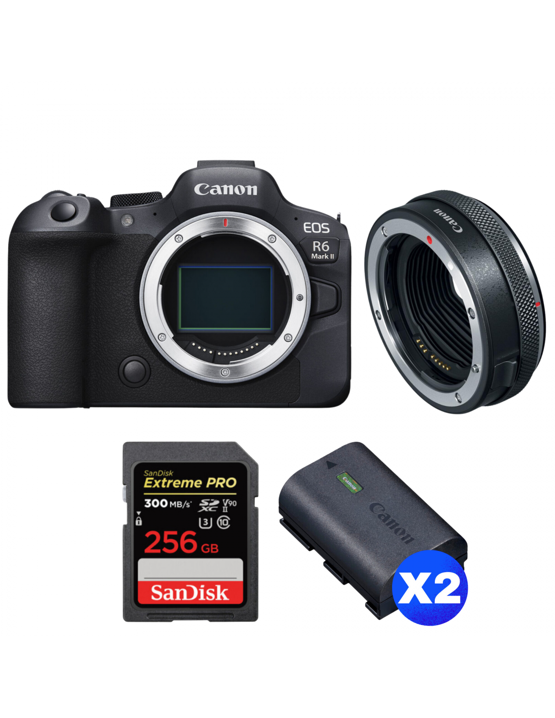 Canon EOS R6 Mark II + Canon EF-EOS R Premium + 1 SanDisk 256GB Extreme PRO UHS-II SDXC 300 MB/s + 2 Canon LP-E6NH