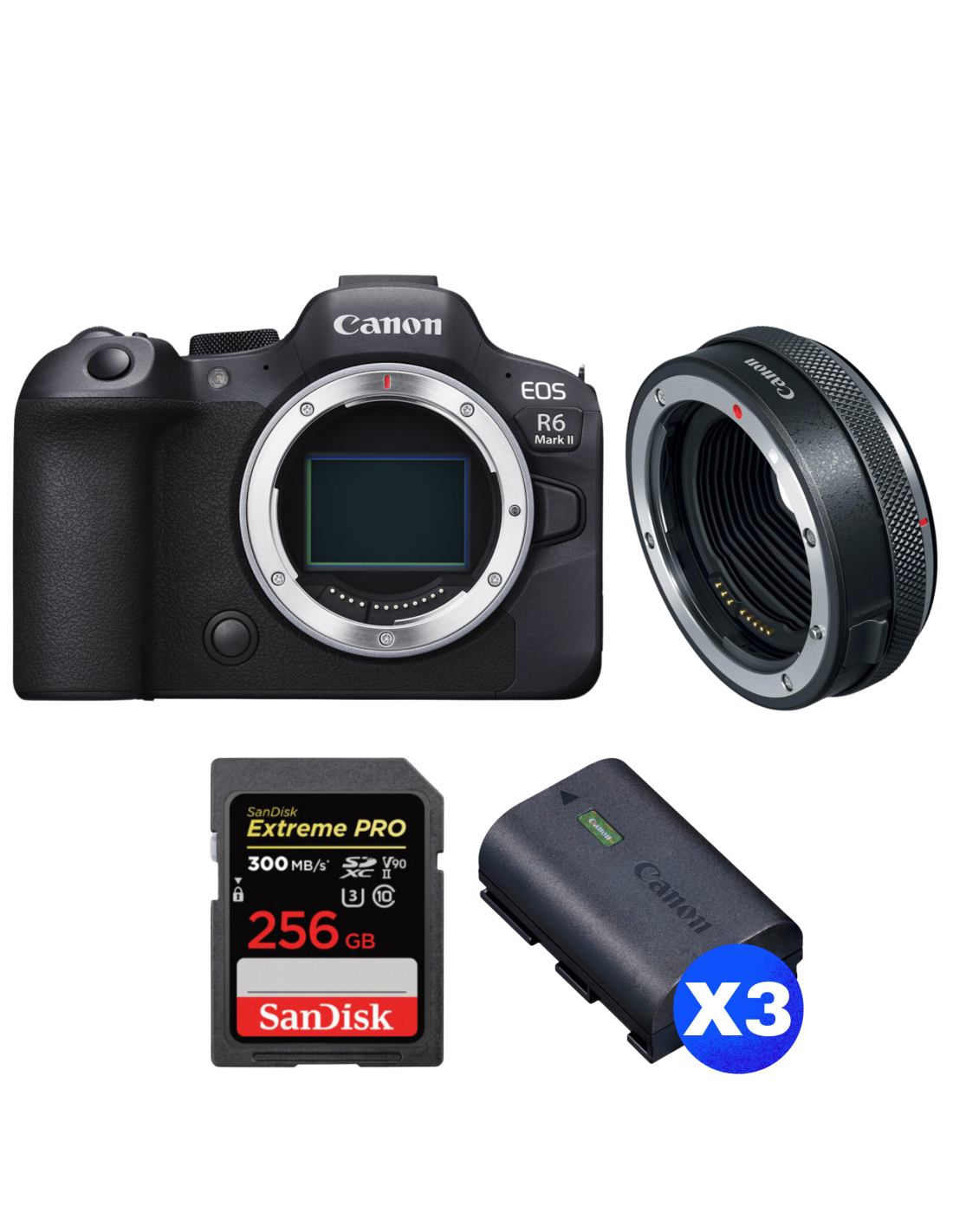 Canon EOS R6 Mark II + Canon EF-EOS R Premium + 1 SanDisk 256GB Extreme PRO UHS-II SDXC 300 MB/s + 3 Canon LP-E6NH