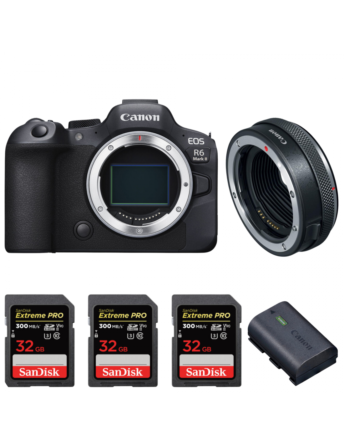 Canon EOS R6 Mark II + Canon EF-EOS R Premium + 3 SanDisk 32GB Extreme PRO UHS-II SDXC 300 MB/s + 1 Canon LP-E6NH