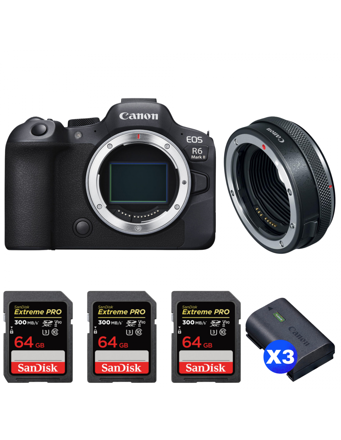 Canon EOS R6 Mark II + Canon EF-EOS R Premium + 3 SanDisk 64GB Extreme PRO UHS-II SDXC 300 MB/s + 3 Canon LP-E6NH