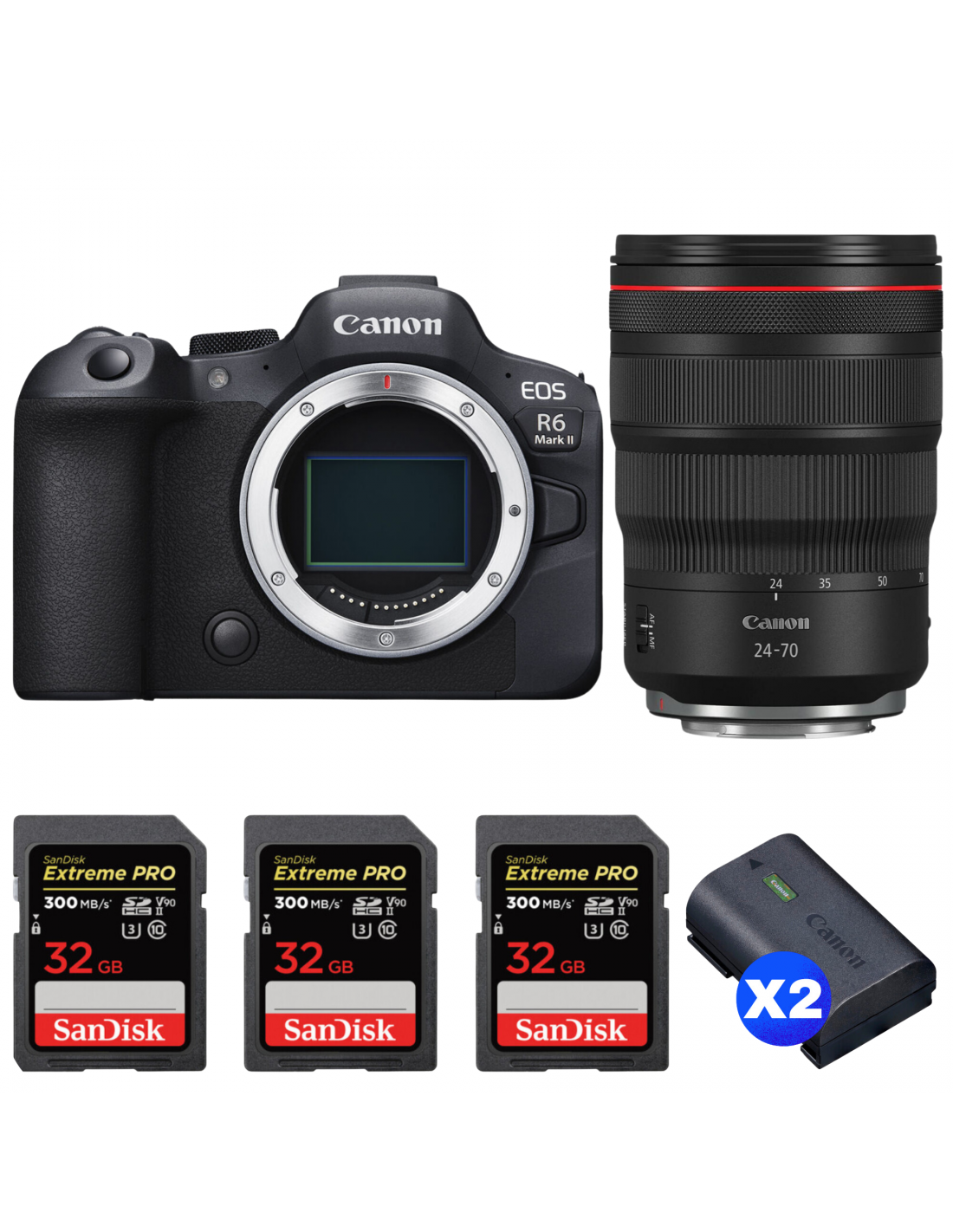 Canon EOS R6 Mark II + RF 24-70 mm f/2,8 L IS USM + 3 SanDisk 32GB Extreme PRO UHS-II SDXC 300 MB/s + 2 Canon LP-E6NH