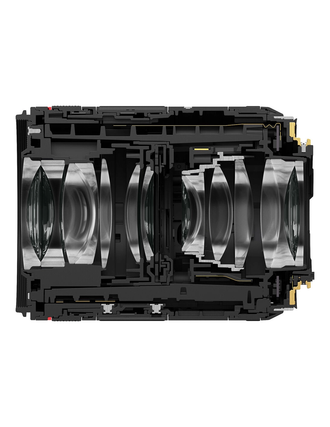 - Construcción óptica : 14 elementos en 11 grupos, con 2 lentes UD (Ultra-baja Dispersión) y 2 lentes asféricas para una calidad de imagen óptima (nitidez de borde a borde, aberraciones minimizadas).