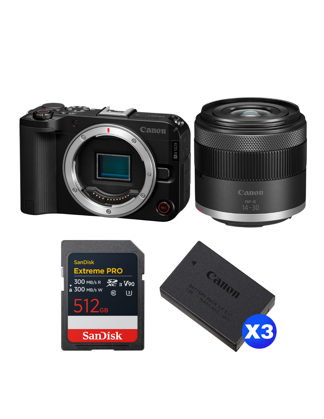 Canon EOS R50 V + RF-S 14-30mm f/4.5-6.3 IS STM PZ + 1 SanDisk 512GB Extreme PRO UHS-II SDXC + 3 Canon LP-E17