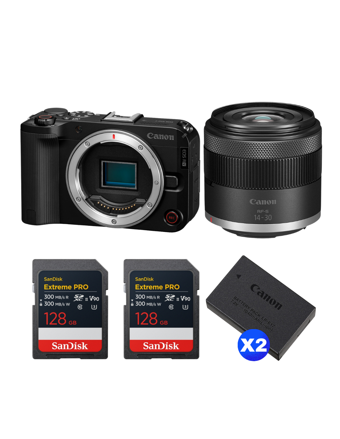 Canon EOS R50 V + RF-S 14-30mm f/4.5-6.3 IS STM PZ + 2 SanDisk 128GB Extreme PRO UHS-II SDXC + 2 Canon LP-E17