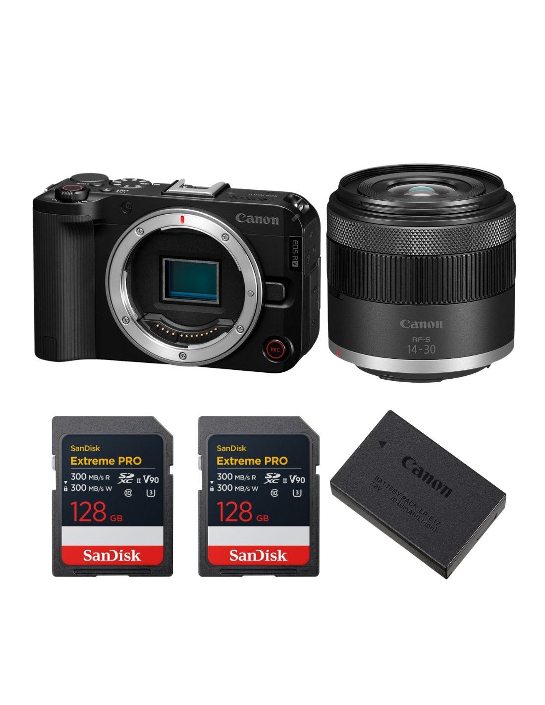 Canon EOS R50 V + RF-S 14-30mm f/4.5-6.3 IS STM PZ + 2 SanDisk 128GB Extreme PRO UHS-II SDXC + Canon LP-E17