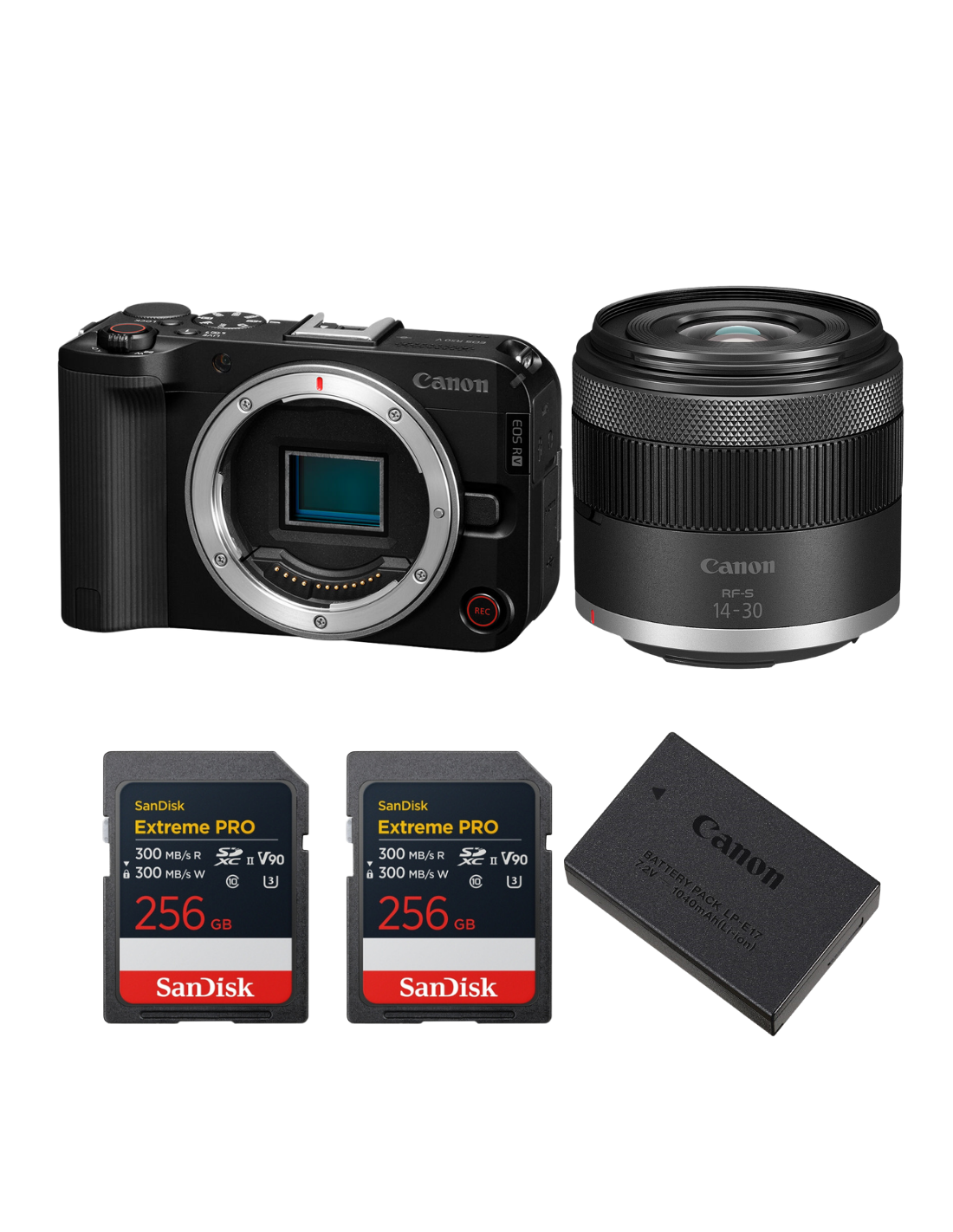 Canon EOS R50 V + RF-S 14-30mm f/4.5-6.3 IS STM PZ + 2 SanDisk 256GB Extreme PRO UHS-II SDXC + Canon LP-E17