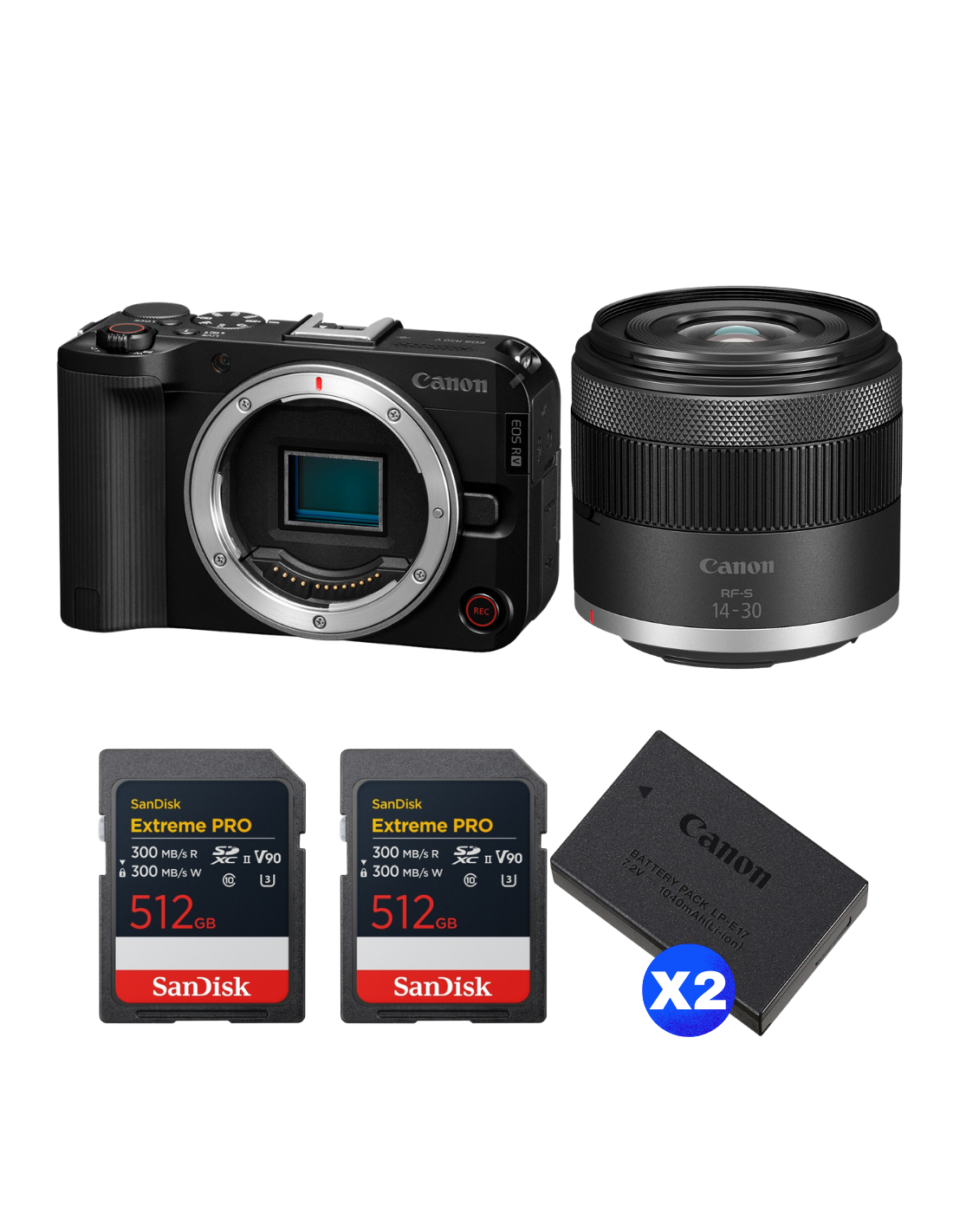 Canon EOS R50 V + RF-S 14-30mm f/4.5-6.3 IS STM PZ + 2 SanDisk 512GB Extreme PRO UHS-II SDXC + 2 Canon LP-E17