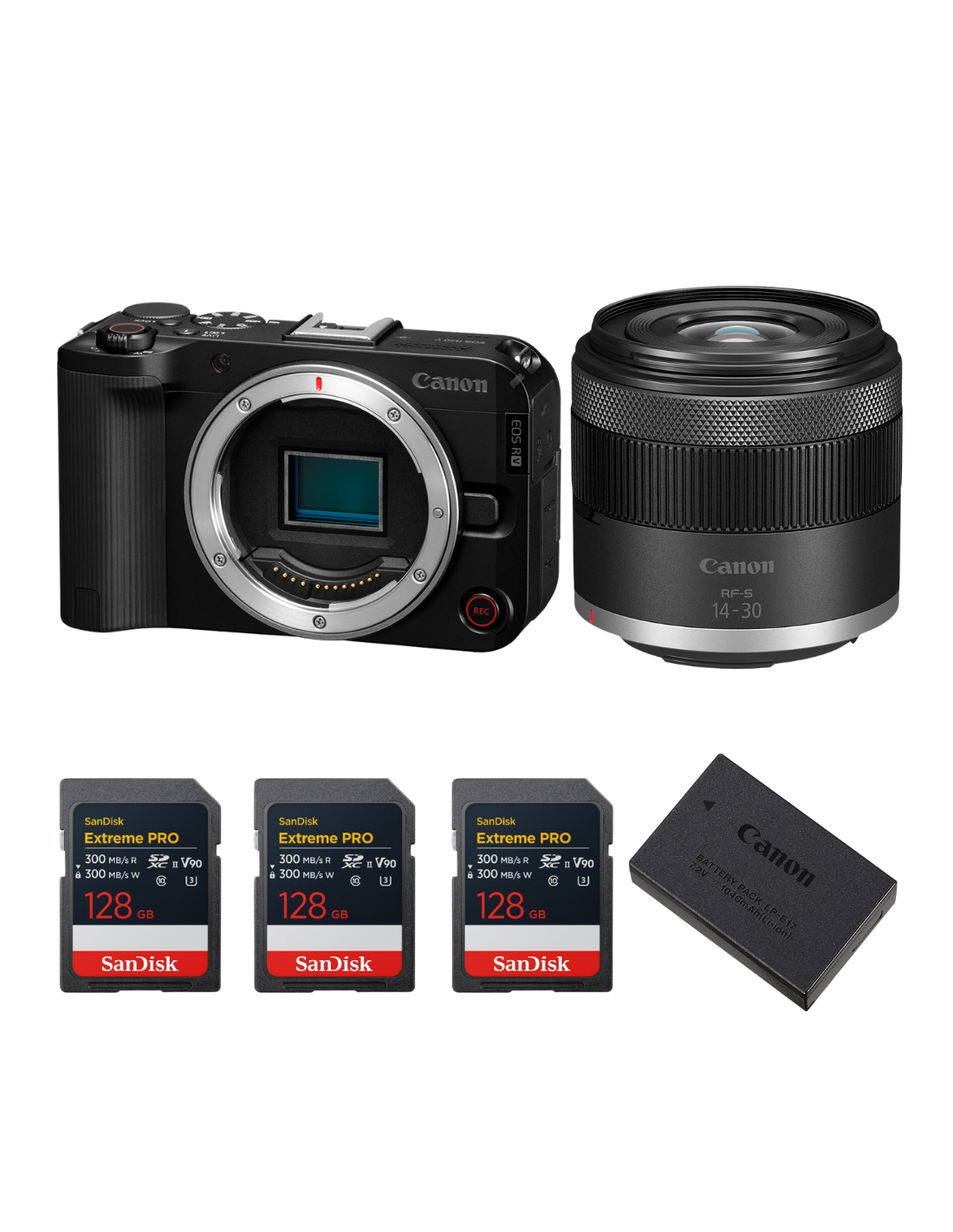 Canon EOS R50 V + RF-S 14-30mm f/4.5-6.3 IS STM PZ + 3 SanDisk 128GB Extreme PRO UHS-II SDXC + Canon LP-E17