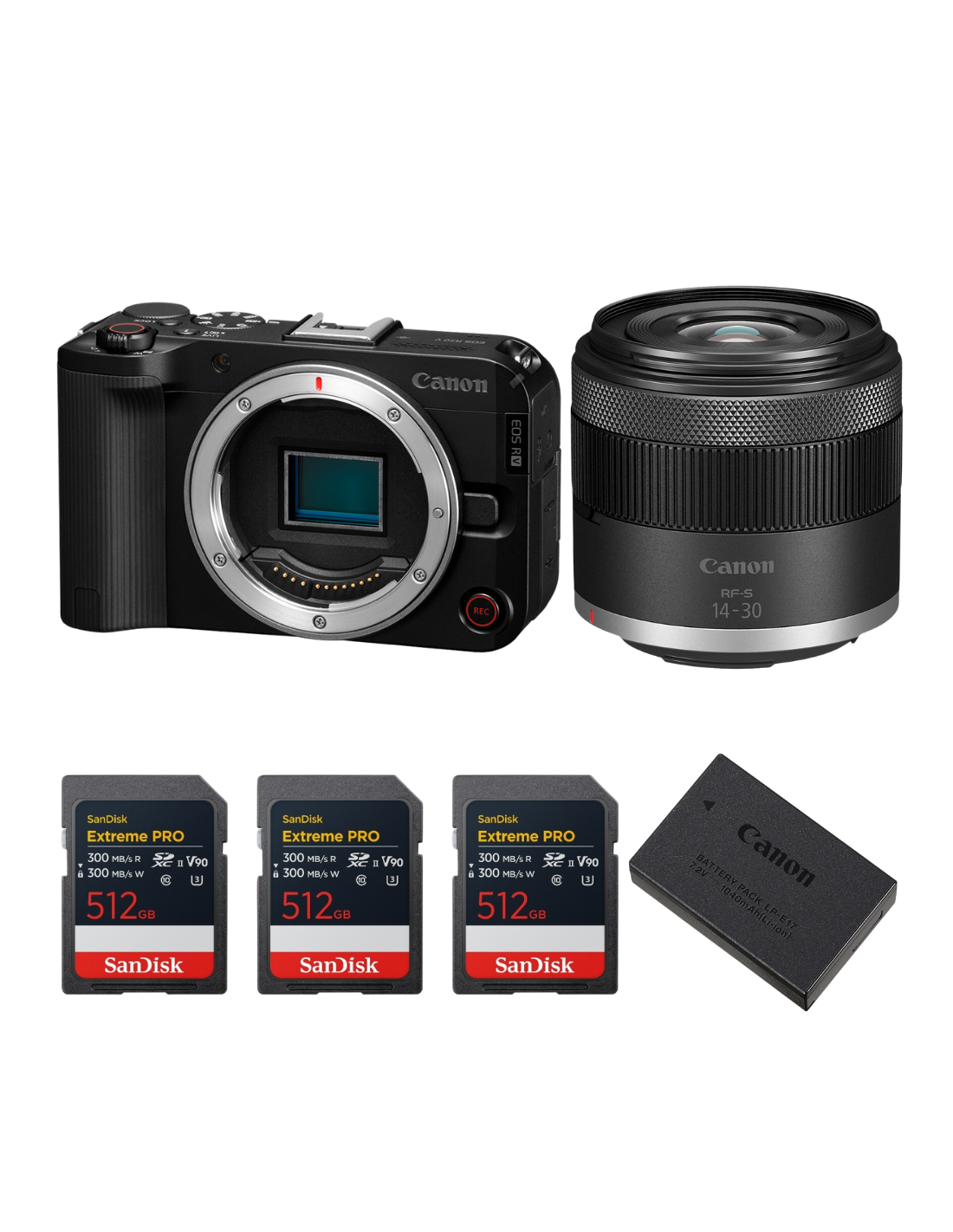 Canon EOS R50 V + RF-S 14-30mm f/4.5-6.3 IS STM PZ + 3 SanDisk 512GB Extreme PRO UHS-II SDXC + Canon LP-E17