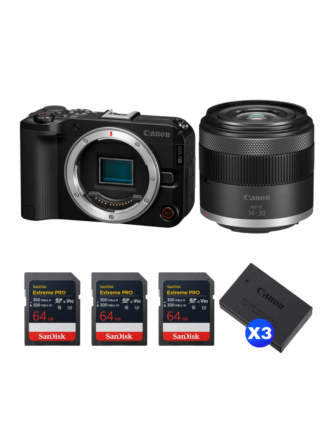 Canon EOS R50 V + RF-S 14-30mm f/4.5-6.3 IS STM PZ + 3 SanDisk 64GB Extreme PRO UHS-II SDXC + 3 Canon LP-E17