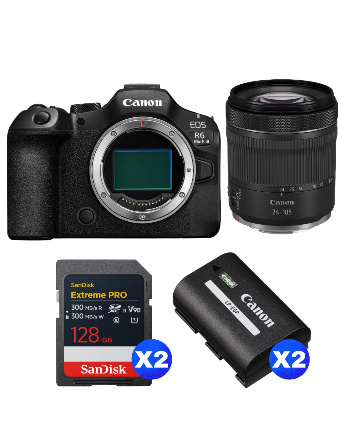 Canon EOS R6 Mark III + RF 24-105mm f/4-7.1 IS STM + 2 SanDisk 128GB Extreme PRO UHS-II SDXC + 2 Canon LP-E6P