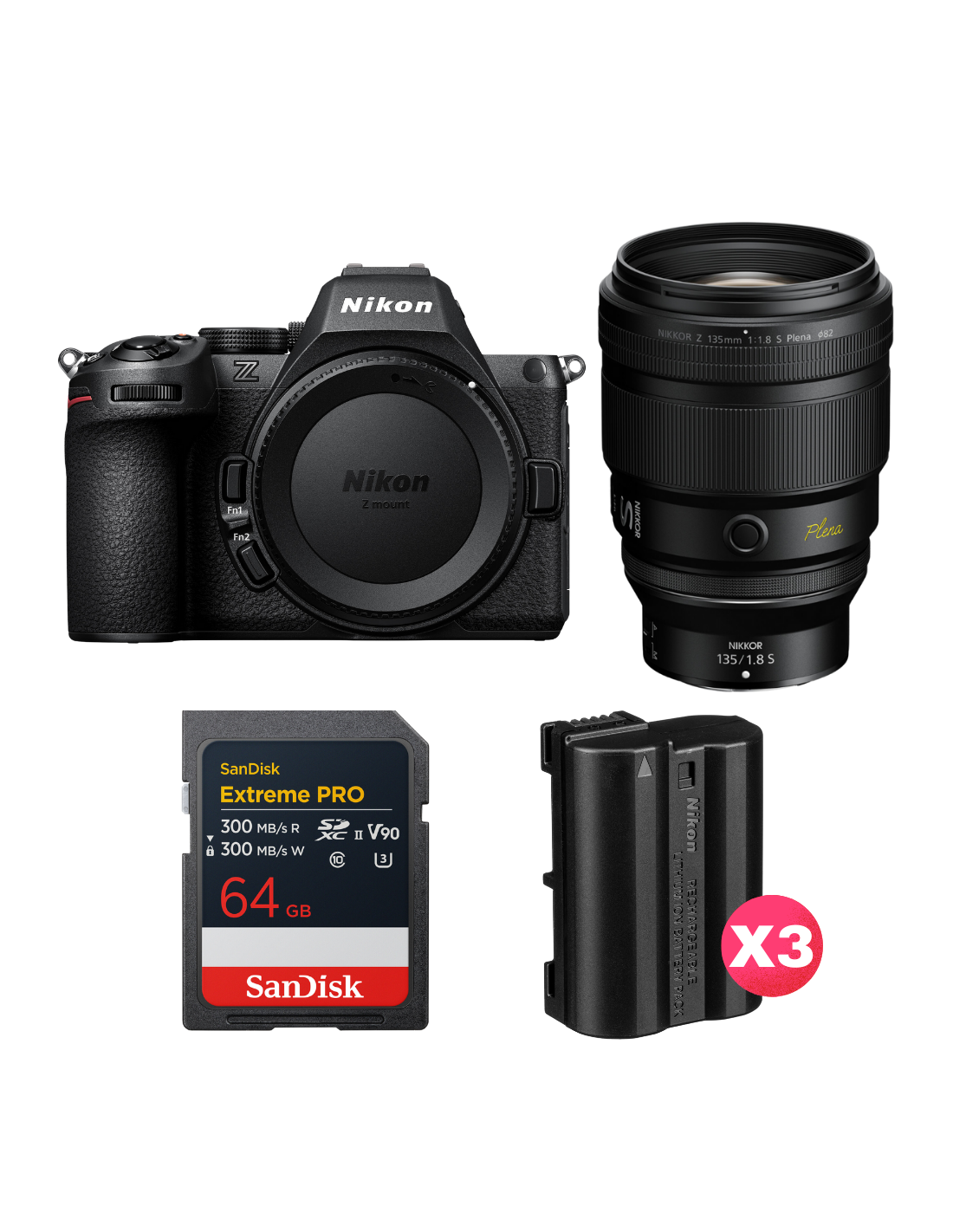 Nikon Z5 II + 135mm f/1.8 S Plena + 1 SanDisk 64GB Extreme PRO UHS-II SDXC + 3 Nikon EN-EL15c