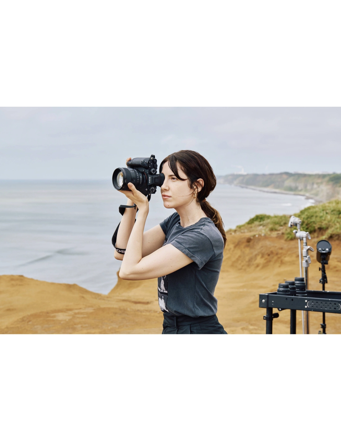 En studio, un photographe de mode prépare une séance pour la couverture d’un magazine. Le modèle est éclairé par des flashs de studio. Chaque pose est travaillée dans les moindres détails et le niveau d’exigence est maximal. Dans ce contexte, le Sony Alpha 1 II se comporte en véritable outil de précision pour le portrait. Chaque fois que le modèle change légèrement d’expression ou de posture, l’Eye AF de l’appareil verrouille instantanément la mise au point sur ses yeux. Cela garantit des portraits d’une netteté chirurgicale au niveau du regard – le point crucial en portrait professionnel. Le photographe peut alors se concentrer sur la direction artistique et l’éclairage sans craindre un loupé de focus. L’Alpha 1 II gère l’aspect technique de la mise au point avec une fiabilité déconcertante.