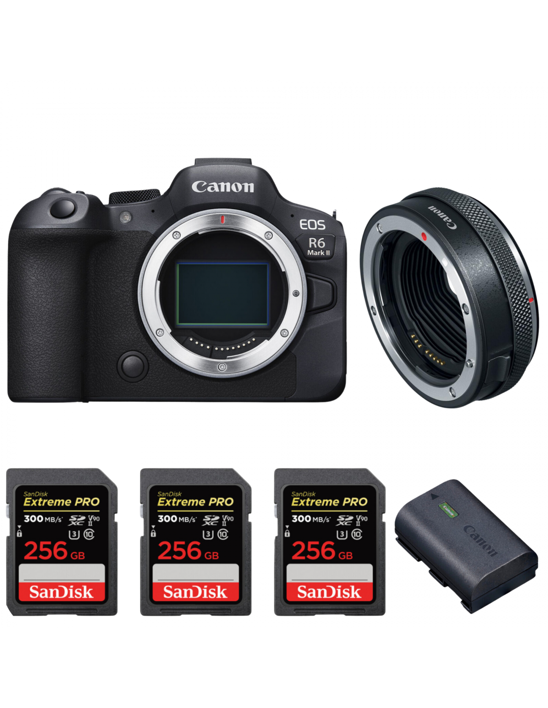 Canon EOS R6 Mark II + Canon EF-EOS R Premium + 3 SanDisk 256GB Extreme PRO UHS-II SDXC 300 MB/s + 1 Canon LP-E6NH
