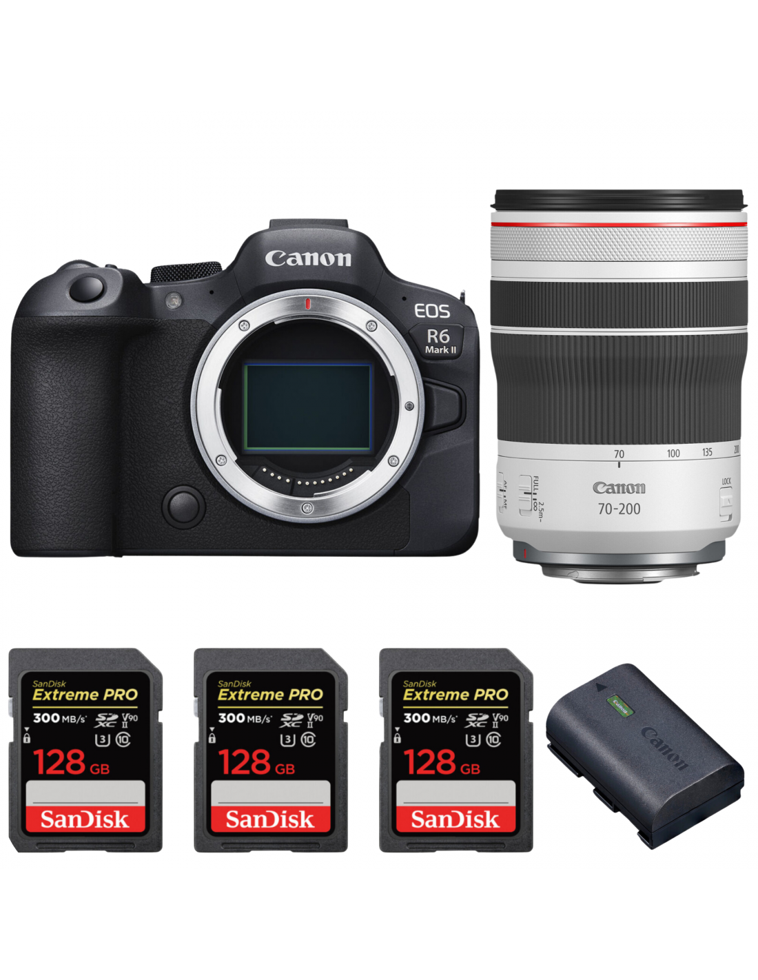 Canon EOS R6 Mark II + RF 70-200mm f/4 L IS USM + 3 SanDisk 128GB Extreme PRO UHS-II SDXC 300 MB/s + 1 Canon LP-E6NH