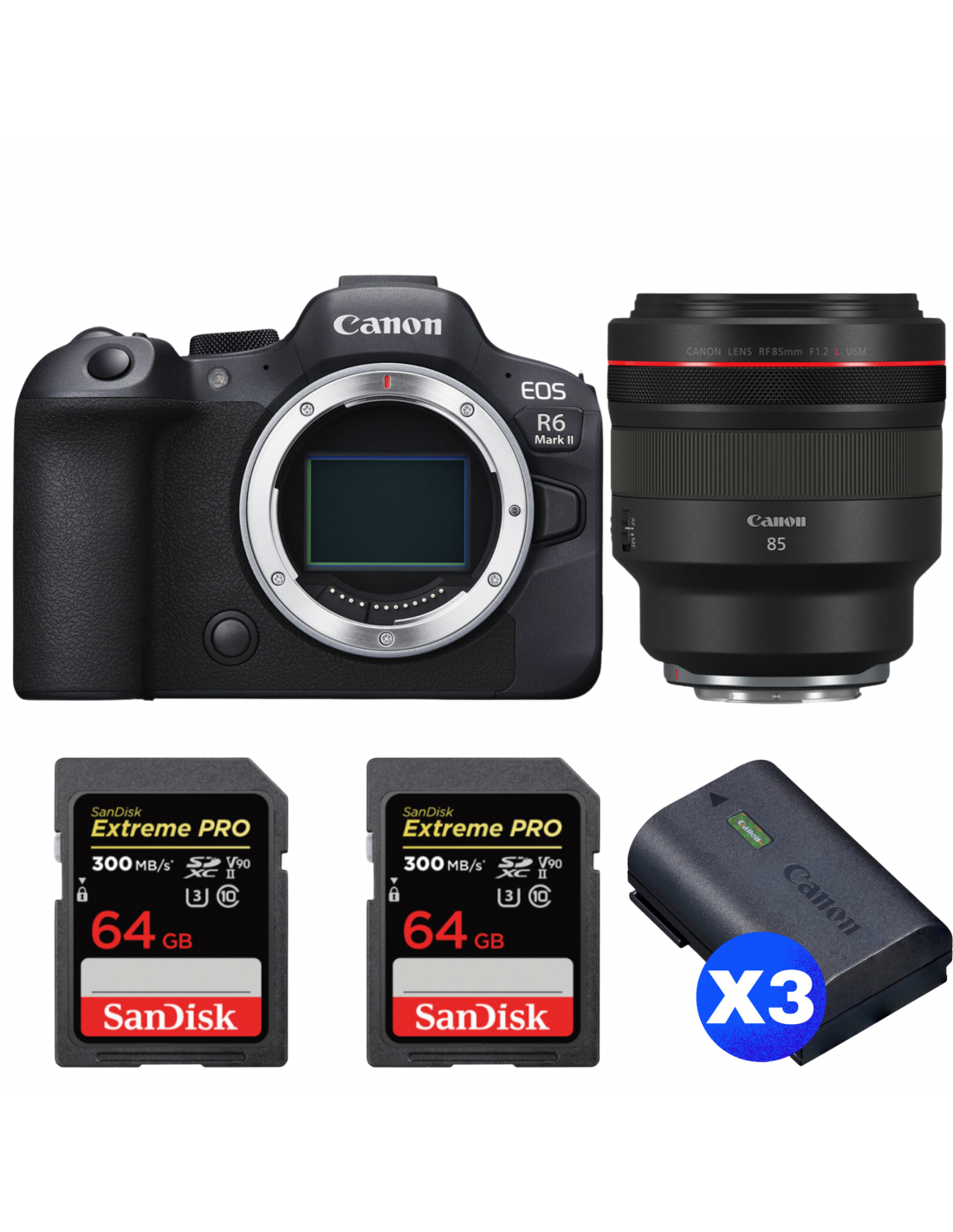 Canon EOS R6 Mark II + RF 85mm f/1.2 L USM + 2 SanDisk 64GB Extreme PRO UHS-II SDXC 300 MB/s + 3 Canon LP-E6NH