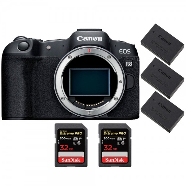 Canon EOS R8 + 2 SanDisk 32GB Extreme PRO UHS-II SDXC 300 MB/s + 3 Canon LP-E17 - Appareil Photo Hybride