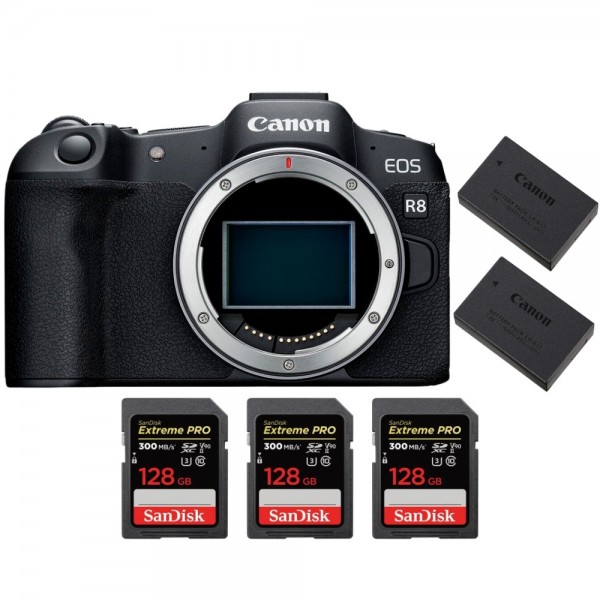 Canon EOS R8 + 3 SanDisk 128GB Extreme PRO UHS-II SDXC 300 MB/s + 2 Canon LP-E17 - Appareil Photo Hybride