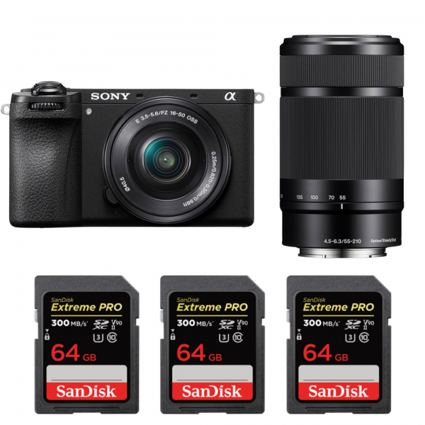 Sony A6700 + 16-50mm f/3.5-5.6 OSS + 55-210mm f/4.5-6.3 OSS + 3 SanDisk 64GB Extreme PRO UHS-II SDXC 300 MB/s