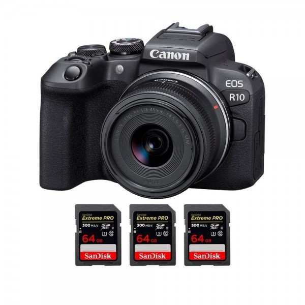 Canon EOS R10 + RF-S 18-45mm F4.5-6.3 IS STM + 3 SanDisk 64GB Extreme PRO UHS-II SDXC 300 MB/s APS-C