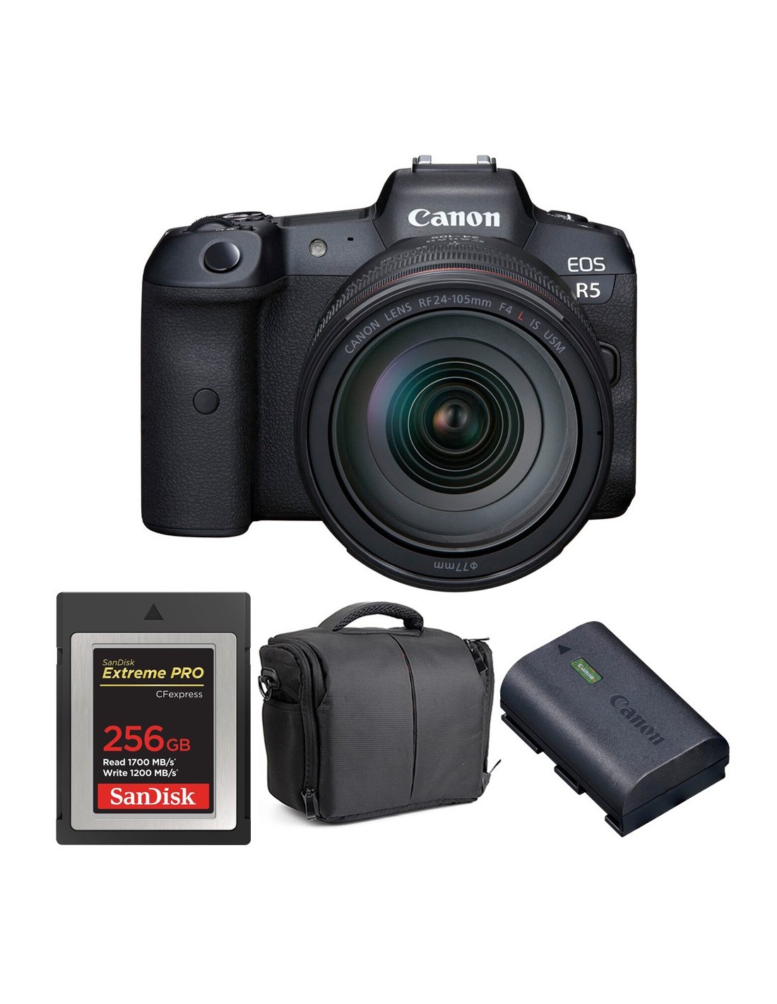 Canon EOS R5 + RF 24-105mm f/4L IS USM + SanDisk 256GB Extreme PRO CFexpress Type B + LP-E6NH + Bag