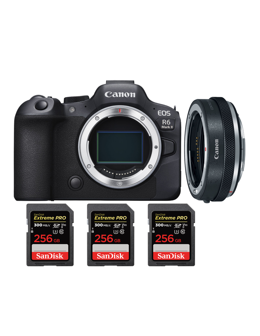 Canon EOS R6 Mark II + Canon EF-EOS R Premium + 3 SanDisk 256GB Extreme PRO UHS-II SDXC 300 MB/s