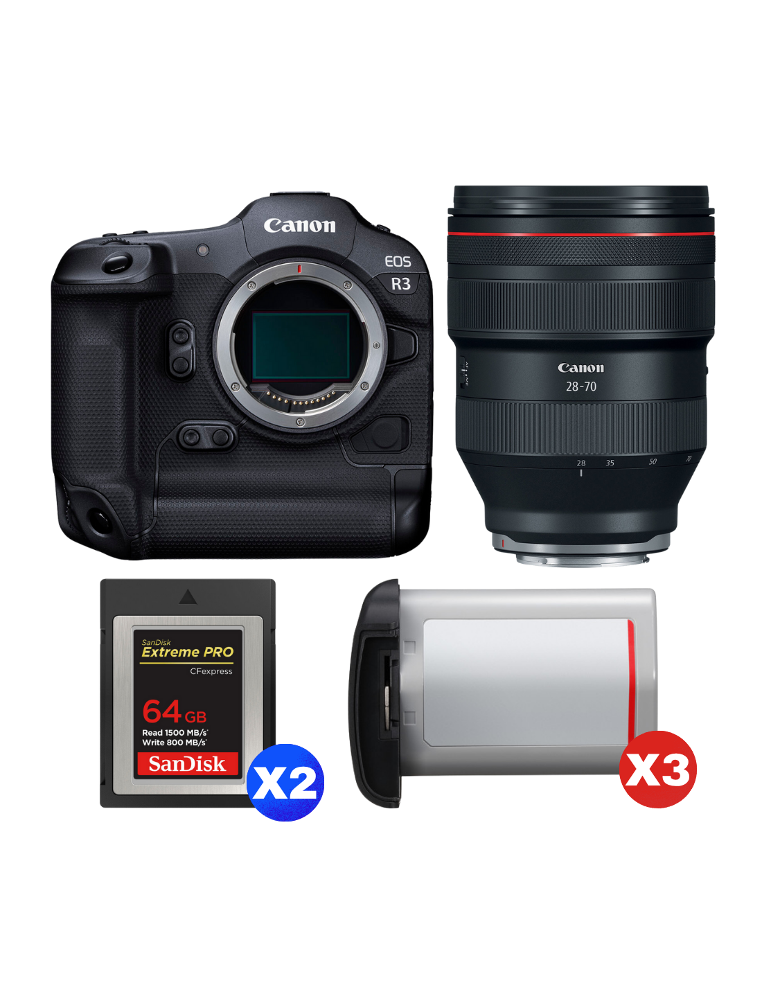 Canon EOS R3 + RF 28-70mm f/2 L USM + 2 SanDisk 64GB Extreme PRO CFexpress Type B + 3 Canon LP-E19