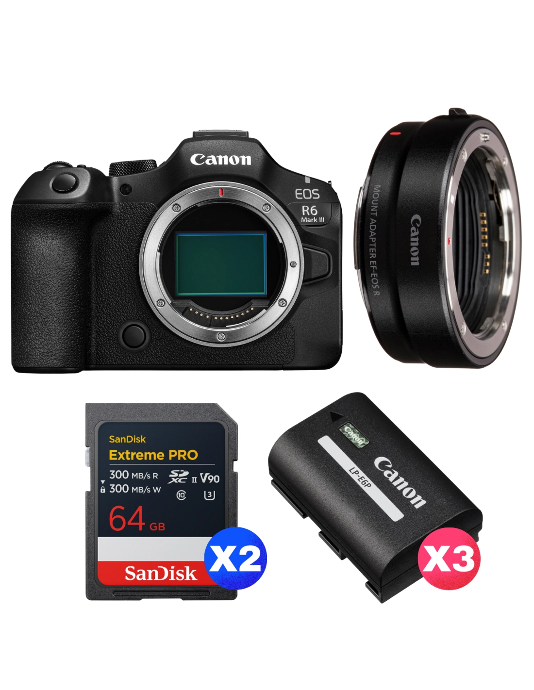Canon EOS R6 Mark III + Canon EF-EOS R + 2 SanDisk 64GB Extreme PRO UHS-II SDXC + 3 Canon LP-E6P