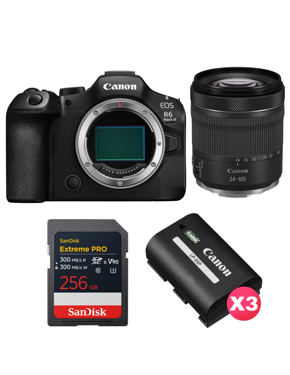 Canon EOS R6 Mark III + RF 24-105mm f/4-7.1 IS STM + 1 SanDisk 256GB Extreme PRO UHS-II SDXC + 3 Canon LP-E6P