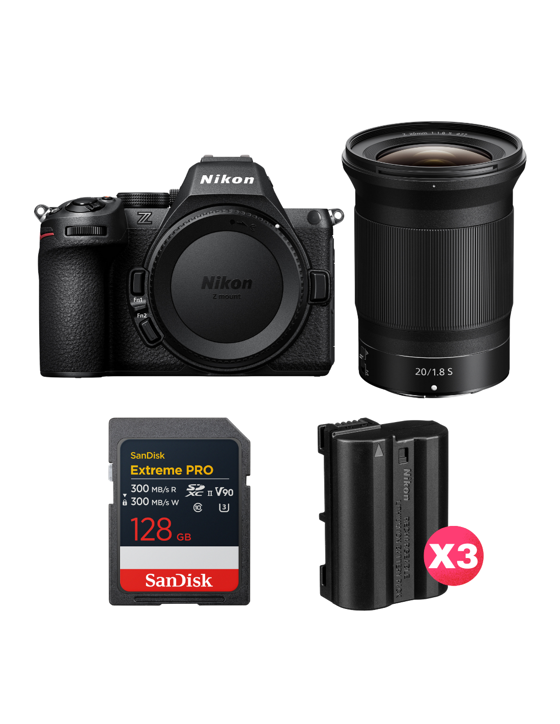 Nikon Z5 II + 20mm f/1.8 S + 1 SanDisk 128GB Extreme PRO UHS-II SDXC + 3 Nikon EN-EL15c