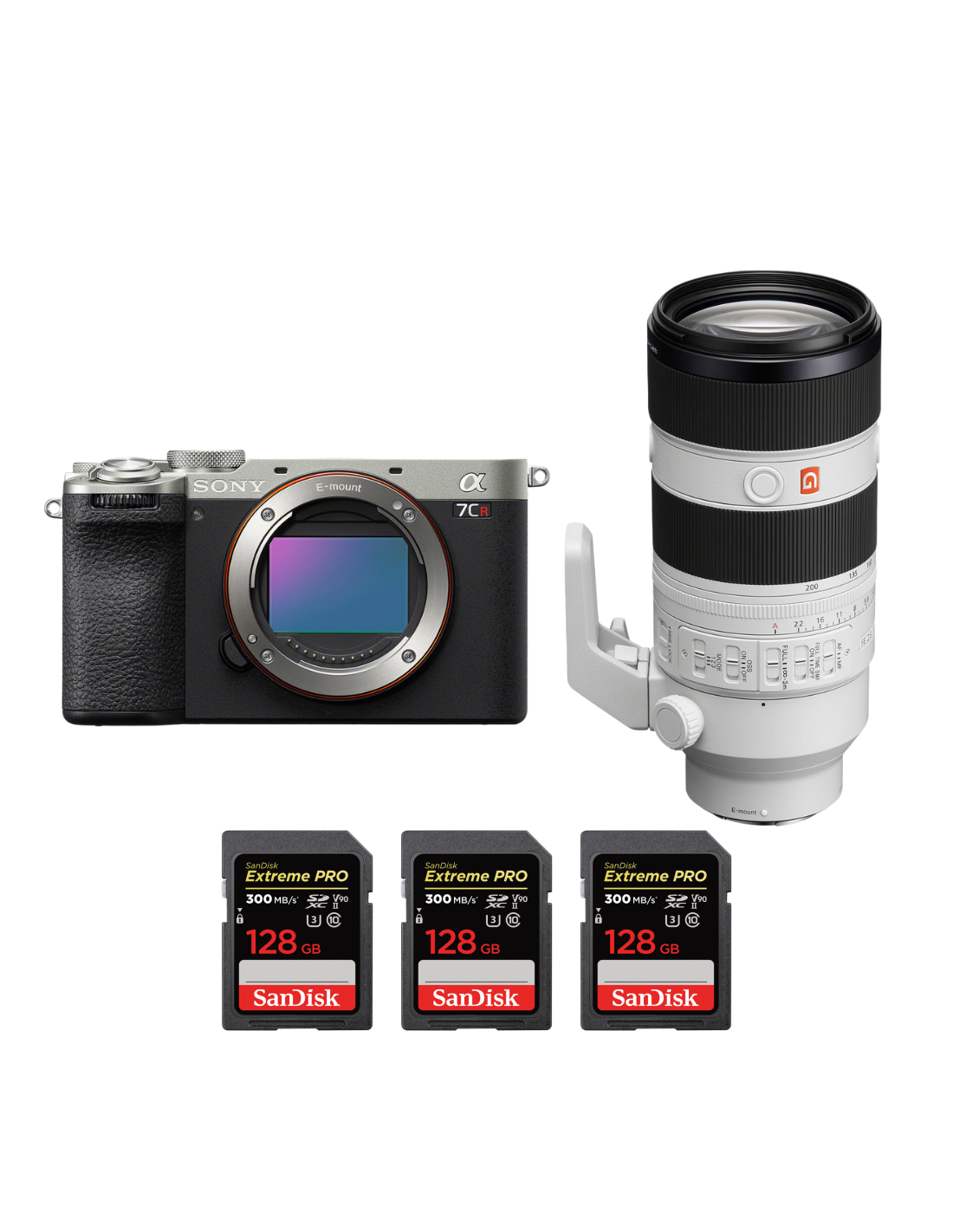 Sony A7CR Silver + FE 70-200mm f/2.8 GM OSS II + 3 SanDisk 128GB Extreme PRO UHS-II SDXC 300 MB/s