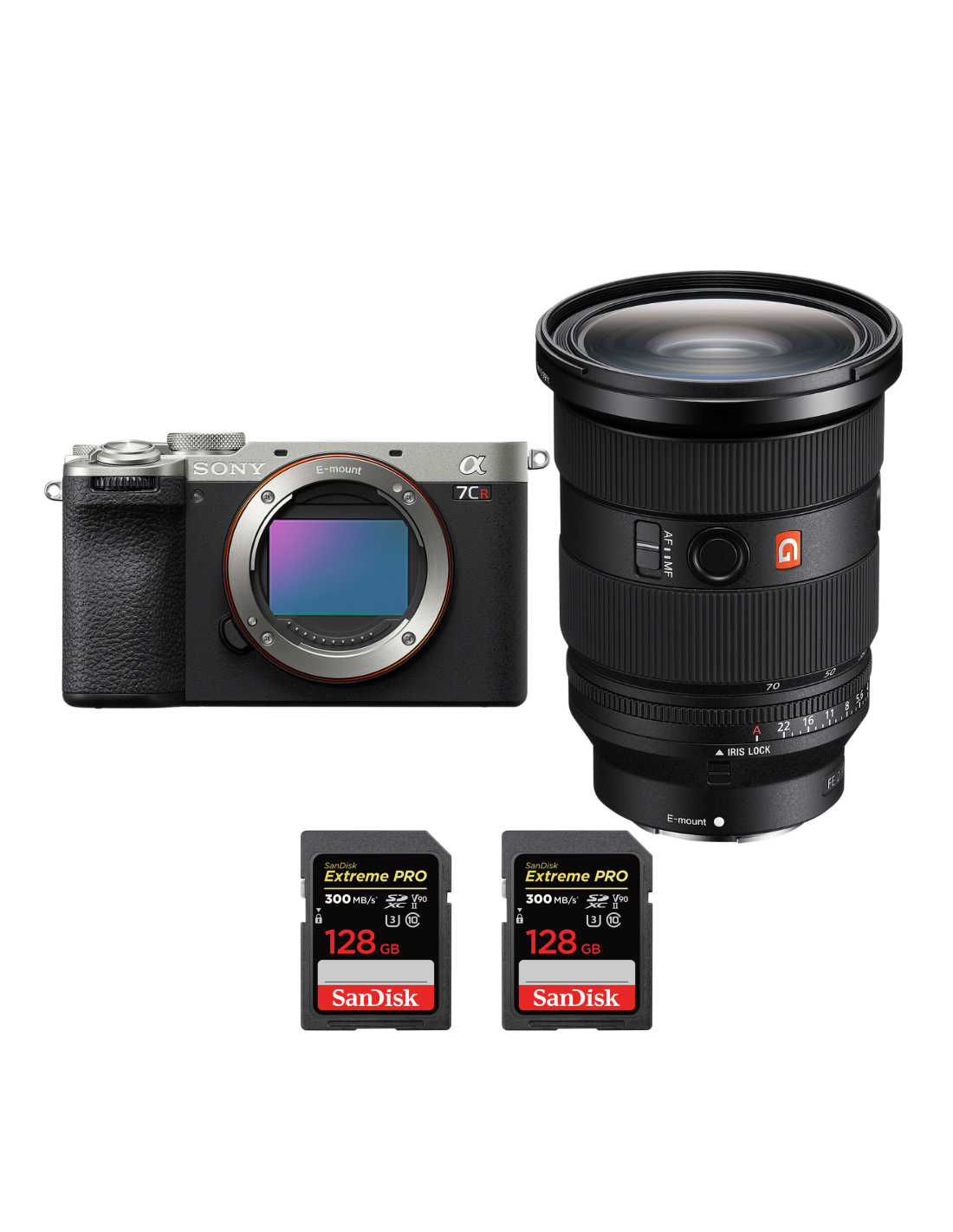 Sony A7CR Silver + FE 24-70mm f/2.8 GM II + 2 SanDisk 128GB Extreme PRO UHS-II SDXC 300 MB/s